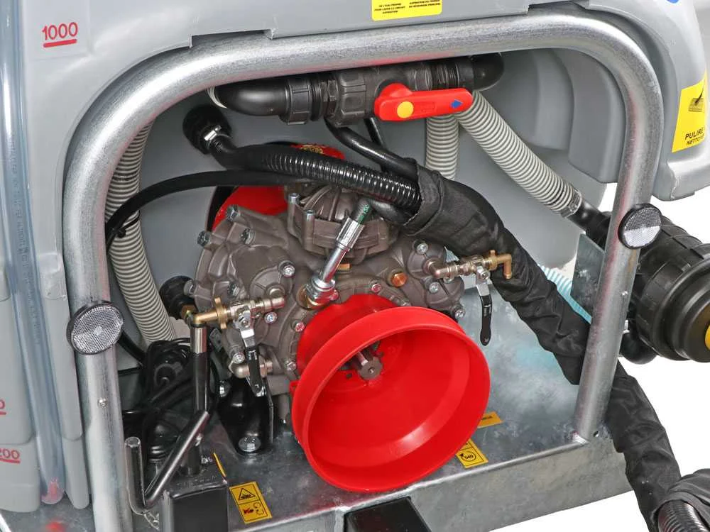 En el corazón del equipo encontramos la bomba Annovi Reverberi AR-1064, equipada con 3 membranas que proporcionan un caudal constante de 115,8 L/min y una presión de trabajo de hasta 50 bar. Su sistema de transmisión con multiplicador en baño de aceite ofrece dos velocidades de trabajo más neutro, permitiendo ajustar el rendimiento según el tipo de tratamiento y la velocidad de avance. El mando de control manual, sencillo e intuitivo, facilita la selección de la presión deseada con precisión.