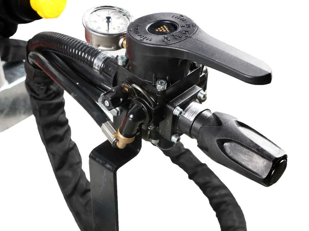 El equipo integra un regulador de presión de tres vías con pomo ergonómico para ajustar el caudal de forma precisa. Un manómetro analógico muestra la presión de trabajo en tiempo real, mientras que dos llaves laterales activan por separado el flujo a cada mitad del ventilador.