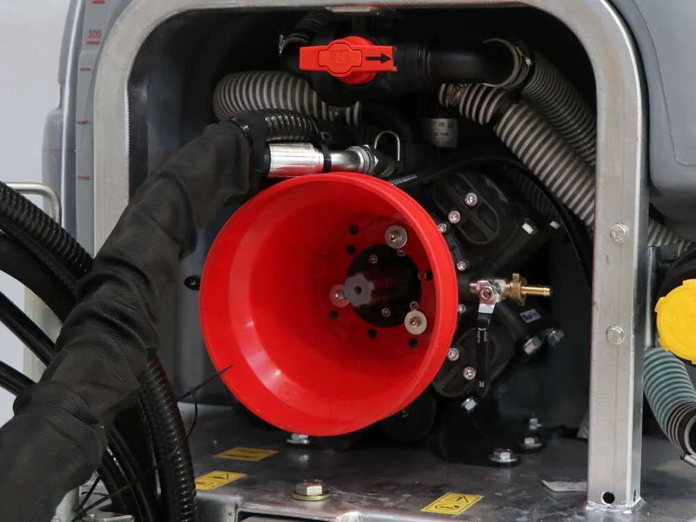 En el corazón del equipo encontramos la bomba Annovi Reverberi AR-1064, equipada con 4 membranas que proporcionan un caudal constante de 108,5 L/min y una presión de trabajo de hasta 50 bar. Su transmisión con multiplicador en baño de aceite ofrece dos velocidades de trabajo más neutro, permitiendo ajustar el rendimiento según el tipo de tratamiento y la velocidad de avance. El mando manual, sencillo e intuitivo, facilita la selección precisa de la presión deseada.