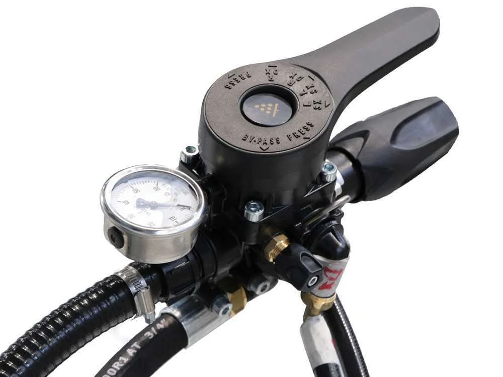 El equipo integra un regulador de presión de tres vías con pomo ergonómico para ajustar el caudal de forma precisa. Un manómetro analógico muestra la presión de trabajo en tiempo real, mientras que dos llaves laterales activan por separado el flujo a cada mitad del ventilador.