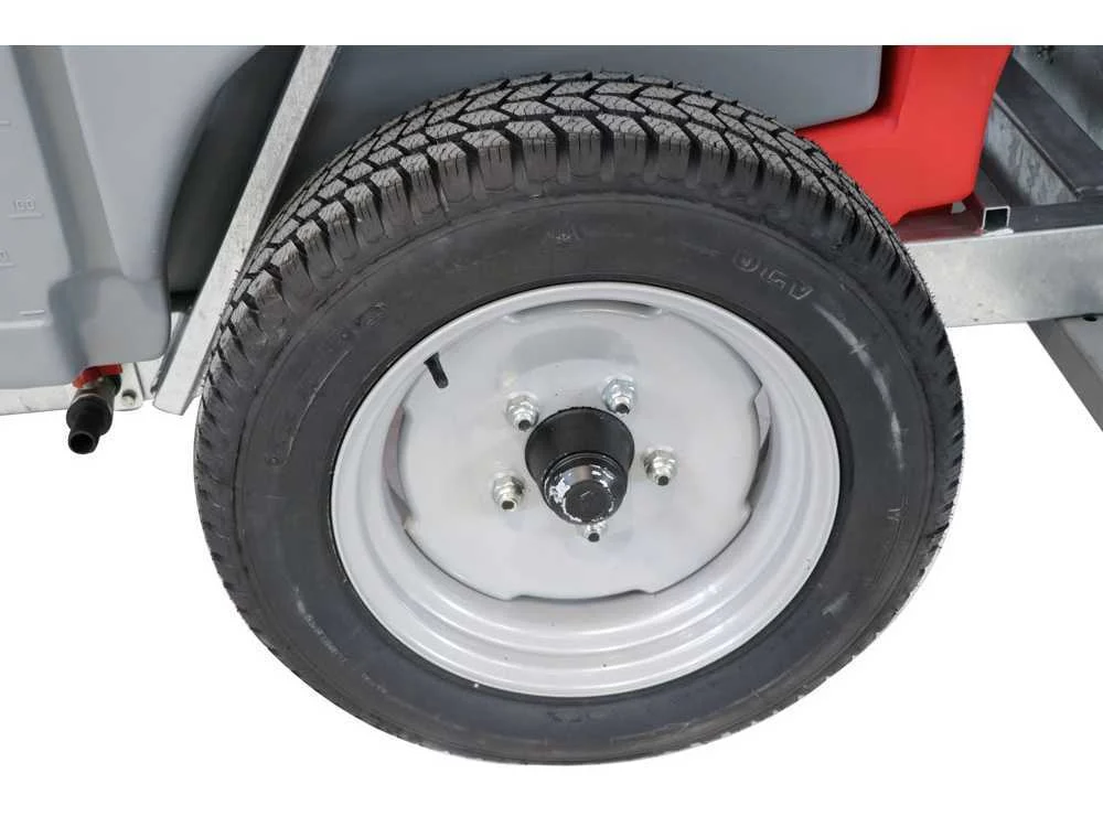 El soporte de rueda, con altura regulable mediante palanca, garantiza una nivelación constante del depósito y mejora la maniobrabilidad. Además, la rueda de apoyo delantero facilita el enganche al tractor y aporta mayor firmeza en cada desplazamiento.