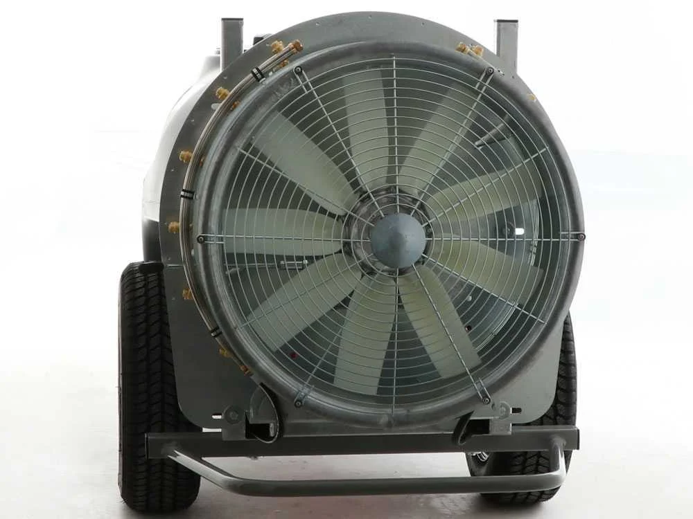 Las nueve palas de nailon reforzado ofrecen ligereza y resistencia a agentes químicos y meteorológicos. Gracias a su diseño axial de aspiración trasera, el caudal de aire alcanza tanto la parte alta del dosel como los laterales, consiguiendo una cobertura óptima en todo tipo de cultivos.