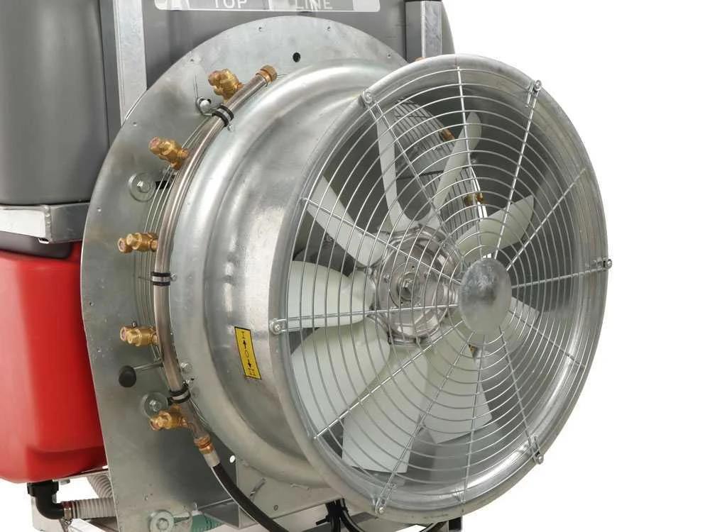 Está equipado con nueve palas de nailon reforzado que combinan ligereza y resistencia a productos químicos y condiciones climáticas adversas. Gracias a su configuración axial de aspiración trasera, el flujo de aire se dirige tanto hacia la parte superior del dosel como a los laterales, logrando una cobertura completa en cualquier cultivo.