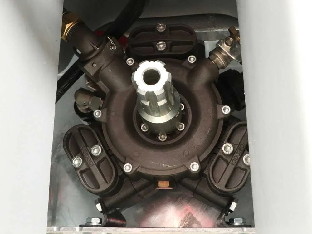 En el núcleo del conjunto, la bomba Annovi Reverberi AR-713 de tres membranas entrega un caudal estable de 76 L/min y alcanza una presión de hasta 40 bar. La transmisión con multiplicador en baño de aceite dispone de dos marchas más neutro para adaptar la intensidad de la pulverización, y el panel remoto facilita el ajuste de caudal y presión sin bajar de la cabina.